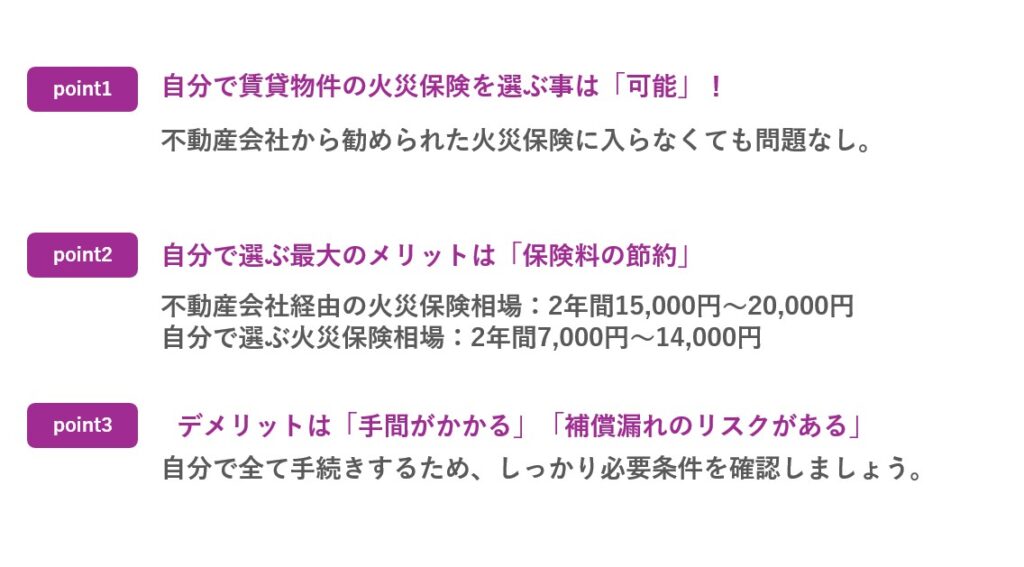 - 保険選びは「地震」「大家への賠償」「水災」の3つの補償を確認することが重要です。
