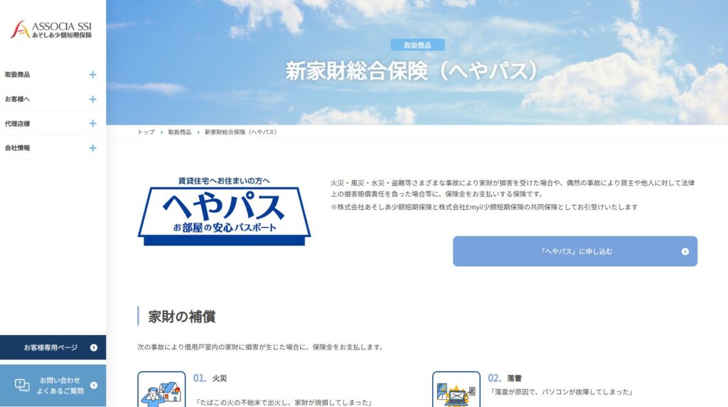 あそしあ少額短期保険の「へやパス」は、水災補償を付帯できる点が大きな特徴です。川沿いの物件や1階に住んでいるなど、水害のリスクが気になる方にとっては検討の価値がある保険と言えます。火災や水漏れといった基本的な補償は一通り備わっています。