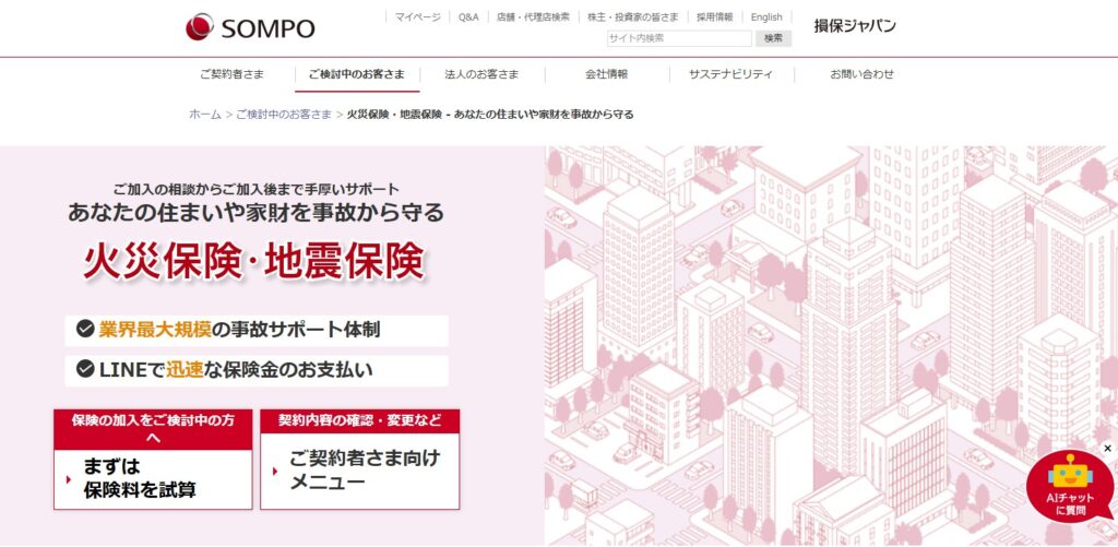 損害保険ジャパン標準~やや高め仮住まい費用など、万が一の際の臨時出費を補う「費用保険金」が手厚い。代理店型被災後の生活再建まで見据えた、手厚いサポートを重視する人。