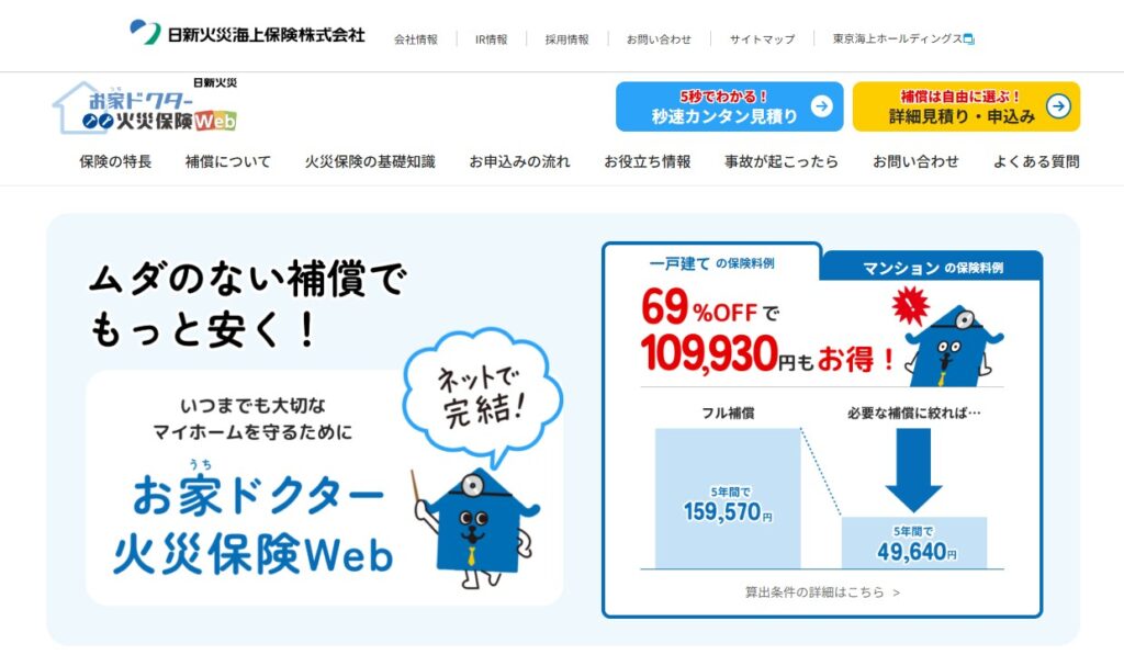 日新火災のお家ドクター火災保険は、ネットから簡単に申し込めるので手続きはスピーディー、郵送やハンコも不要です。保険のプロに相談せず、とにかく自分で早く申し込みしたいという方には選択肢の一つになるでしょう。